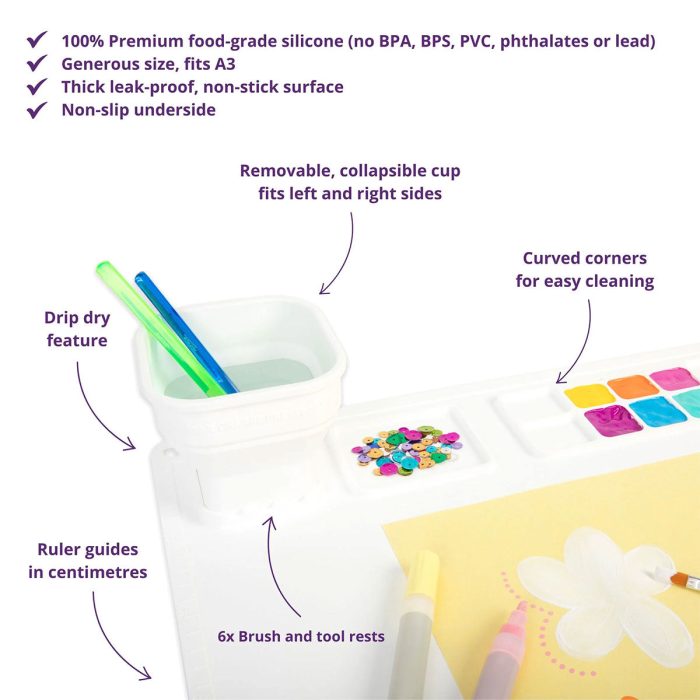 What You’ll LoveConvenient: No more soggy newspapers, icky plastic tablecloths or piles of paper plates and cups! Our generous, waterproof silicone mat is simple to set up and pack away.Easy To Clean: With our silky-smooth top surface, rounded corners, raised lip, non-slip underside and drip-dry functionality, cleaning up is child’s play! Machine-washable and dishwasher-safe too!Travel-friendly: The foldable silicone mat and removable, collapsible cup fit neatly into the included breathable mesh bag. Compact for travel and storage.Practical Design: Ample storage ensures nothing gets lost. Central cavities take care of fine items, such as pins and needles, while paintbrushes stay put in the scalloped cup trays. Vertical and horizontal rules make measuring quick and easy. White colour is perfect for painters who appreciate colour accuracy.Inclusive: Two in-built cup trays keep both left-handed and right-handed creators happy!Quality Materials: Our mats and cups are made from 100% premium food-grade silicone (no BPA, BPS, PVC, phthalates, lead or latex). We use recycled post-consumer polyester (discarded plastic water bottles!) for our breathable mesh storage bags.