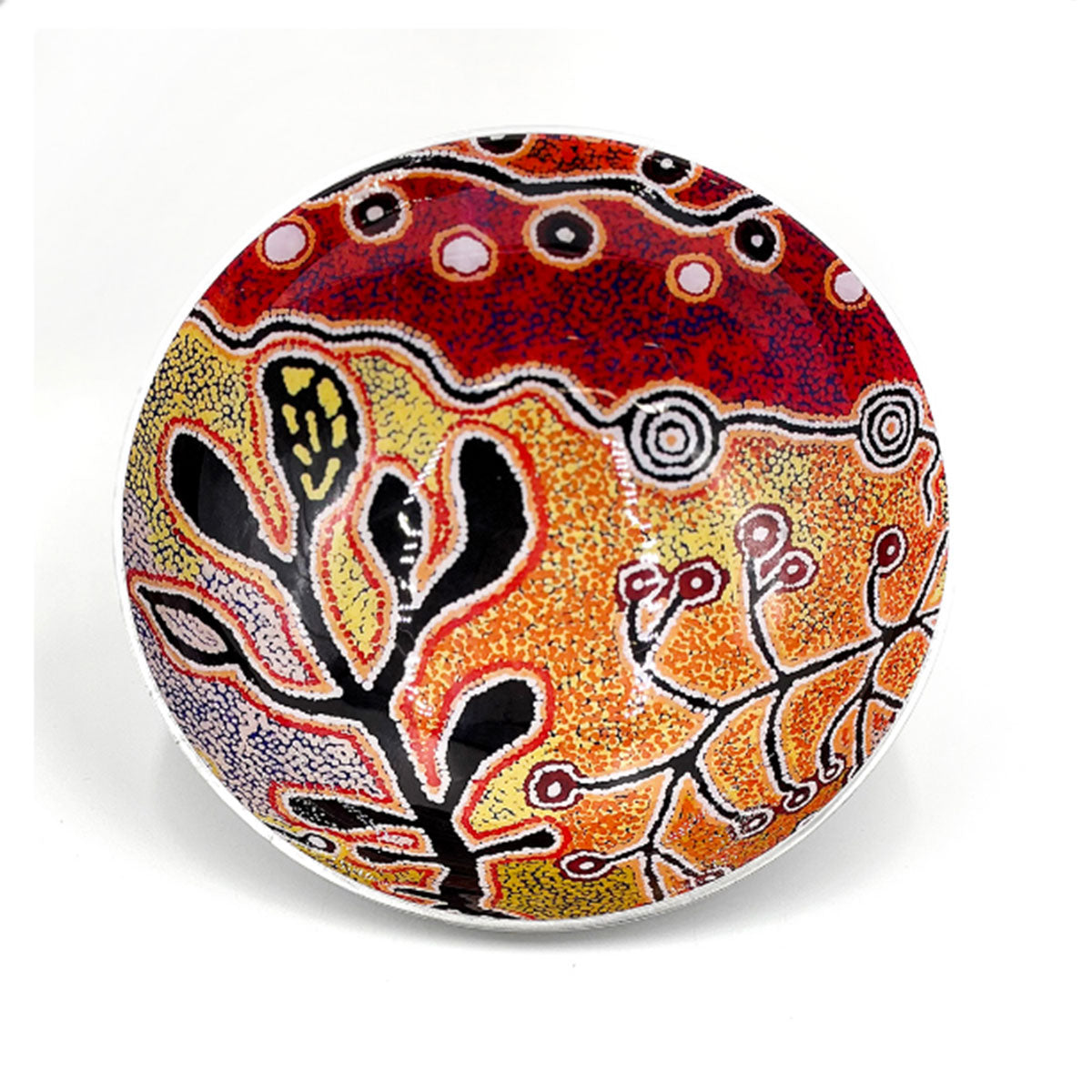 Salad Bowl Small 24x24x5cm-PST690Artist: Paddy StewartThis design shows the Yam and Bush Tomato Dreaming. You can see the Yams and the small round berries of the Bush Tomatoes. In the Dreamtime the people used to eat these fruits and vegetables, just as our old people lived off them. The artist painted this painting to teach the children.