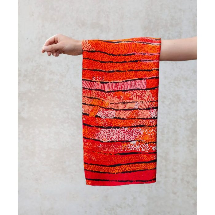 Naata’s untitled painting depicts designs associated with the soakage water site of Unkunya, west of the Pollock Hills in Western Australia. The associated Tjukurrpa (Dreaming Story) tells of two snakes that passed through this site after travelling far from the east. The twin soakages that define this site were formed by the snakes as they disappeared underground. During mythological times, a group of ancestral women travelling from the west passed through Unkunya on their way to Marrapinti. The women stopped at Marrapinti to make ceremonial nose bones, also known as marrapinti, which were traditionally worn through the septum. The women continued their travels to the east, passing through Ngaminya and Wirrulnga, collecting kampurarrpa (desert raisins) from the small shrub Solanum centrale along the way.Naata’s blazing palette and dynamic line-work breathe life into the journey of the two snakes as they shape the site of Unkunya. The artist’s repetitive use of parallel lines conjures both the travels of the women and the shapes of marrapinti they created along their way.92cm x 105cm 16mm 100% silk satin with hand rolled edges and double sided printing.