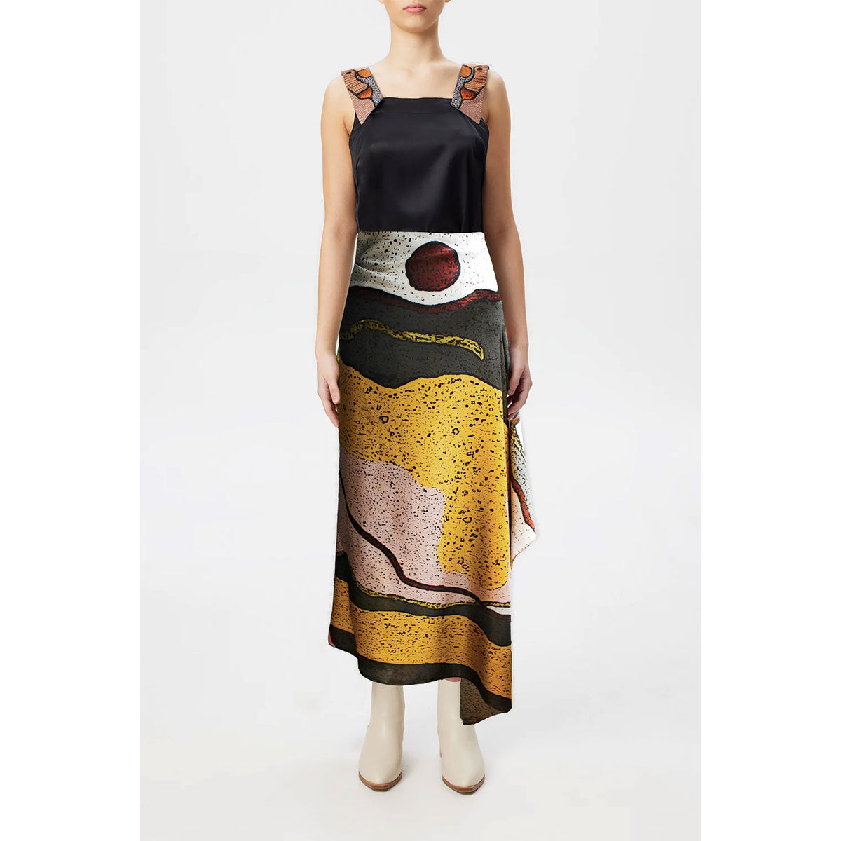 Suppose you want to add a fresh piece of First Nations artwork to your wardrobe. In that case, the Yilawura rectangle scarf is the perfect accessory. The dynamic colours of ochre, pink and grey tones make for a striking and versatile accessory piece. You can layer this over garments – go on, treat yourself!Fabric CareComposition: 92% Silk, 8% ElastaneProduct DetailsRectangle Scarf180cm x 100cmStoryGija man, Lindsay Malay works from the Warmun Art Centre, located 200kms outside of Kunnannura in the Kimberley, Western Australia. Warmun is renounced for its artists’ use of natural ochre and pigments to denote a contemporary expression of Country and culture and its reputation is felt both nationally and internationally due to the calibre of highly successful artists in the community.Lindsay’s work is vibrant and transfixing, telling the story of Warlawoon, the Country he inherited from his Grandfather and of which his family regained traditional ownership of in 2010.