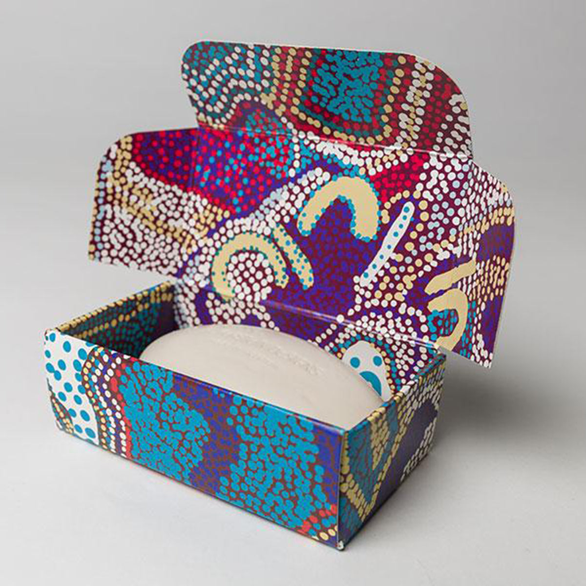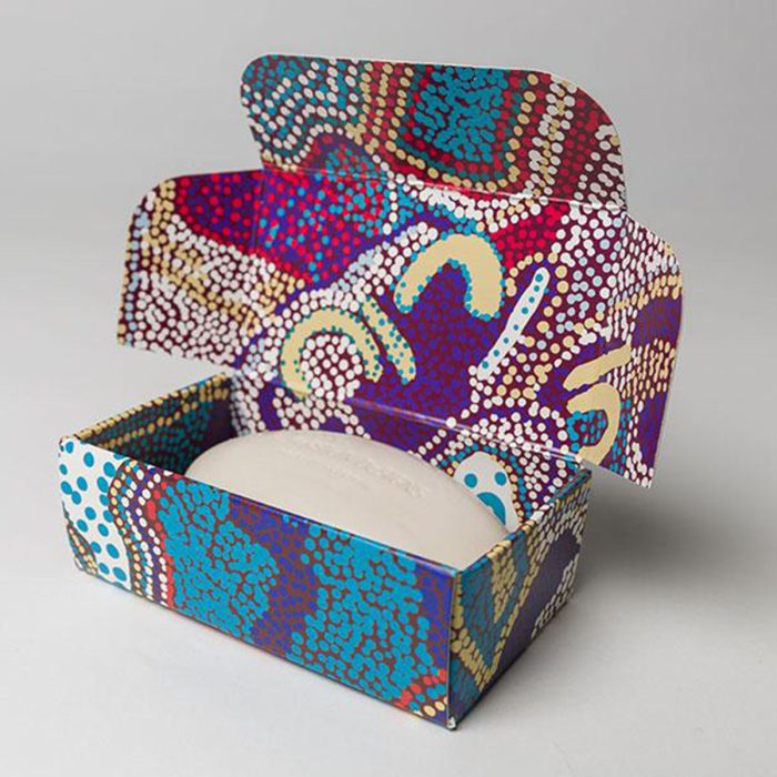 Royalties from this product directly benefit the artist and their community.Kakadu Plum & Cassis Body Bar with Goats Milk and Shea Butter.Beautiful Australian Made Soap presented in a gift box featuring artwork by Elaine Lane from Papulankutja Artists in Western Australia.150g (5.29oz).Made in Australia.Gift BoxedNot tested on animalsPapulankutja (Blackstone) is a remote Aboriginal Community, located at the foothills of the Blackstone Ranges in the Ngaanyatjarra Lands, Western Australia. As well as their paintings Papulankutja Artists are known for their innovative fibre work and carvings from local wood.