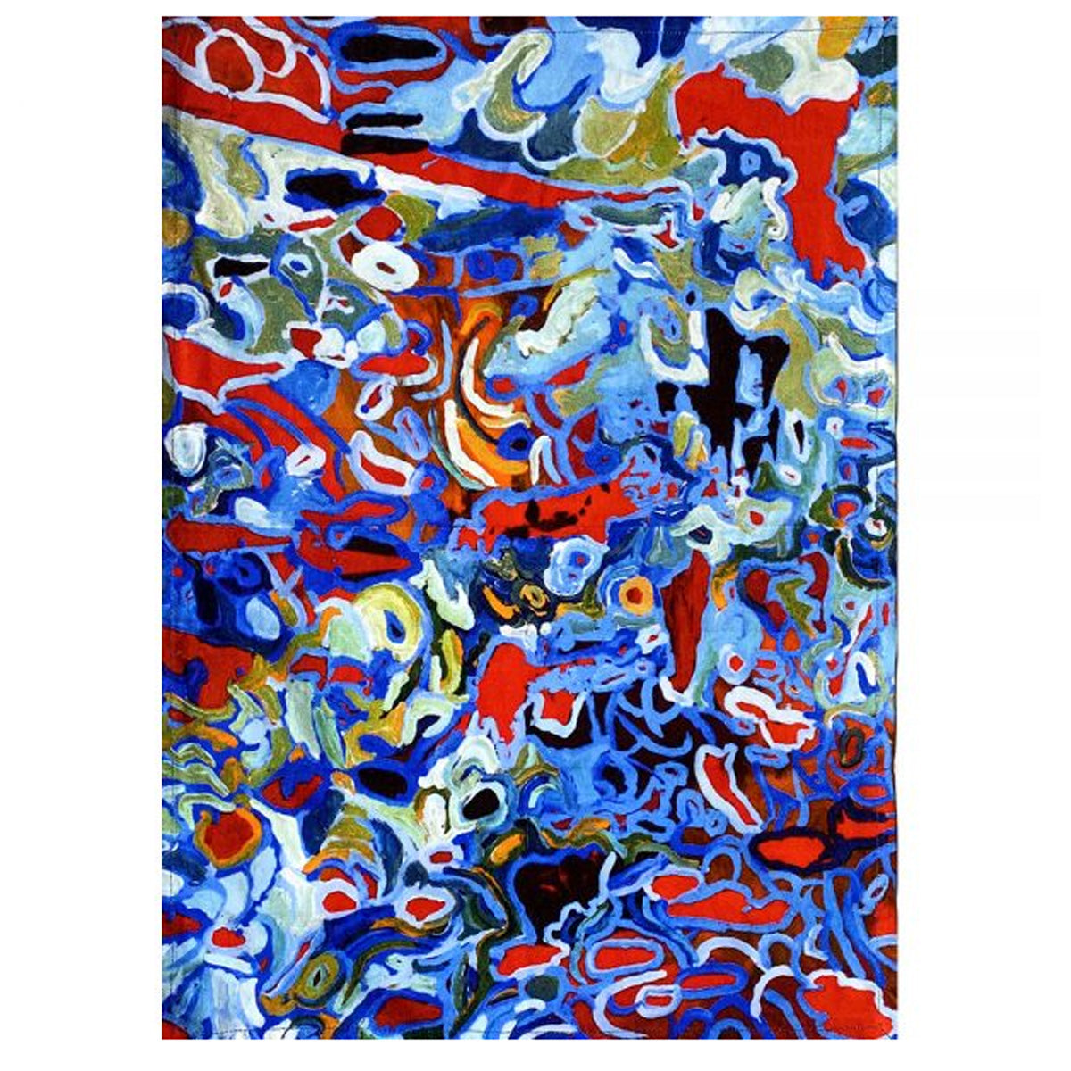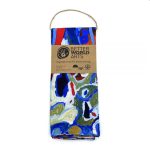 Cotton Tea Towel – Digital Print-SJN616Janganpa Jukurrpa (common brush-tail possum [Trichosurus vulpecula] Dreaming) travels all over Warlpiri country. Janganpa are nocturnal animals that often nest in the hollows of white gum trees (wapunungka). This story comes from a big hill called Mawurrji, west of Yuendumu and north of Pikilyi (Vaughan Springs). A group of janganpa ancestors resided there. Every night they would go out in search of food. Their hunting trips took them to Wirlki and Wanapirdi, where they found pamapardu (flying ants). They journeyed on to Ngarlkirdipini looking for water. A Nampijinpa women was living at Mawurrji with her two daughters. She gave her daughters in marriage to a Jupurrurla janganpa but later decided to run away with them. The Jupurrurla angrily pursued the woman. He tracked them to Mawurrji where he killed them with a stone axe. Their bodies are now rocks at this place. Warlpiri people perform a young mens initiation ceremony, which involves the Janganpa Jukurrpa. The Janganpa Jukurrpa belongs to Jakamarra/Jupurrurla men and Nakamarra/Napurrurla women. In Warlpiri paintings traditional iconography is used to represent this Jukurrpa. Janganpa tracks are often represented as shaped figures and concentric circles are used to depict the trees in which the janganpa live, and also the sites at Mawurrji. ©2018