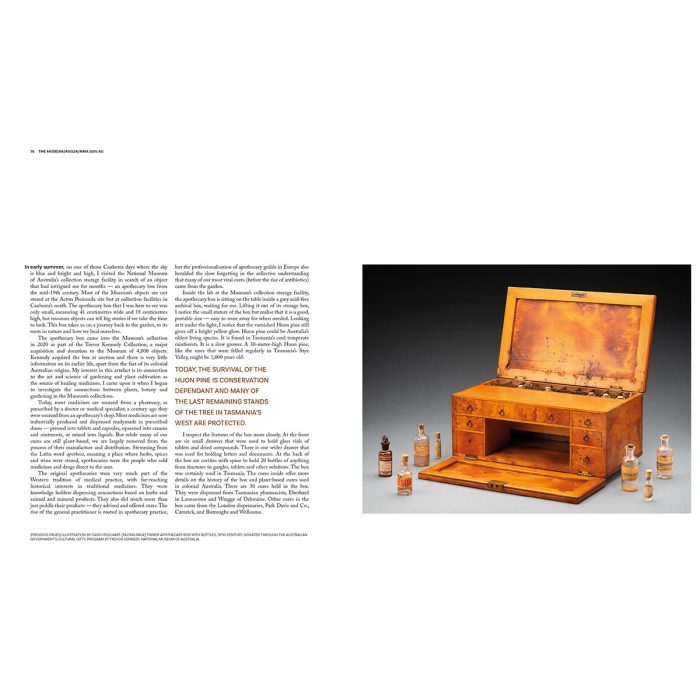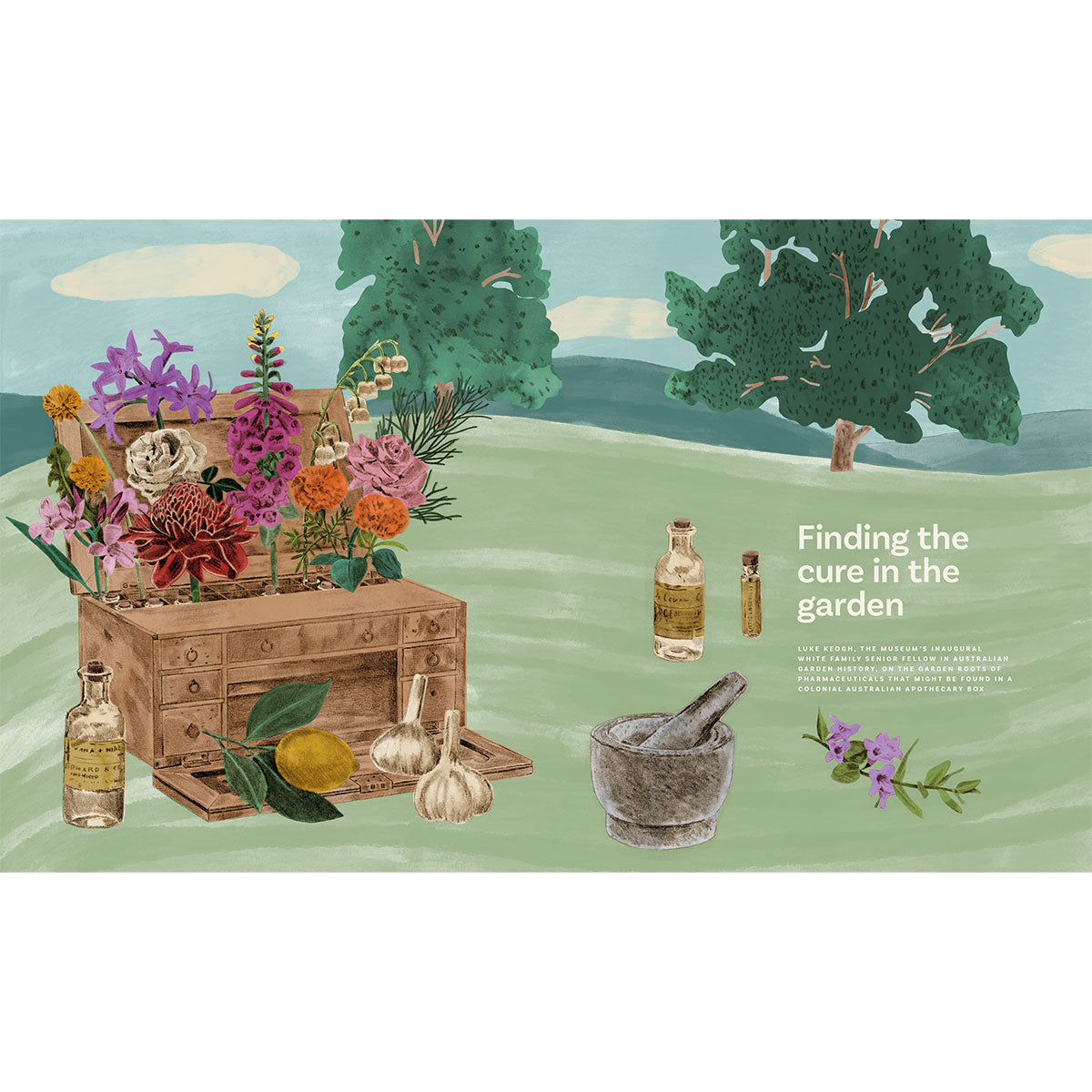 – Martha Sear on how plants and gardens feature in the Museum’s collections – and what collecting and gardening have in common.- Luke Keogh on the garden roots of pharmaceuticals in a colonial Australian apothecary box.- Adam Shipp takes a stroll through the Museum’s Christina and Trevor Kennedy Garden to reveal a world of native wonder plants.- Coen Ramalli celebrates the ‘Life. Be in it.’ wellbeing campaign and Ivy Loric – the inspiration behind Aunty Ivy and the ‘Come ’n Try Gardening’ drive.- An Indigenous perspective on the Garden of Australian Dreams with Margo Neale.- Tim Entwisle explores why we should not feel constrained when taking ourselves down the garden path.- Lesley Head on farm-made berry preserves, settler-colonial history and climate change.- An illustrated pictorial essay by Cheryl Crilly on Carter’s Floral Illustrations by artist James Andrew from the Museum’s Springfield–Faithfull family collection.- Ananth Gopal looks at suburban gardening by migrant cultures in Australia.- Eve Sullivan on 1950s aspirations and the quarter-acre block.- And deep time encounters in the garden with Fiona McMillan-Webster.
