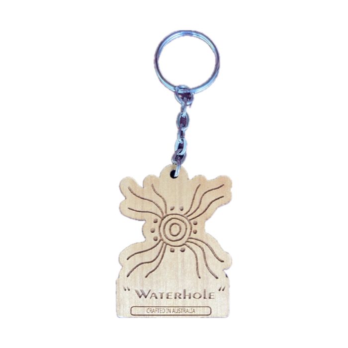 This Murra Wolka wooden keyring features an Indigenous design of a waterhole, symbolising the importance of water and its connection