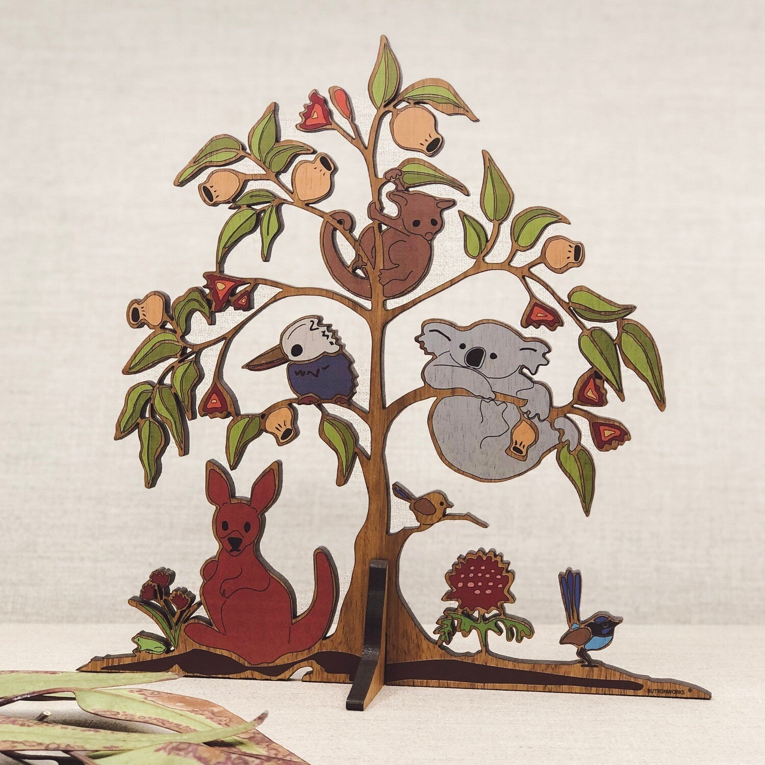Standing sculptural Gum Tree featuring of popular native Australian animals and birds. Each tree is made from sustainably sourced Australian timber an