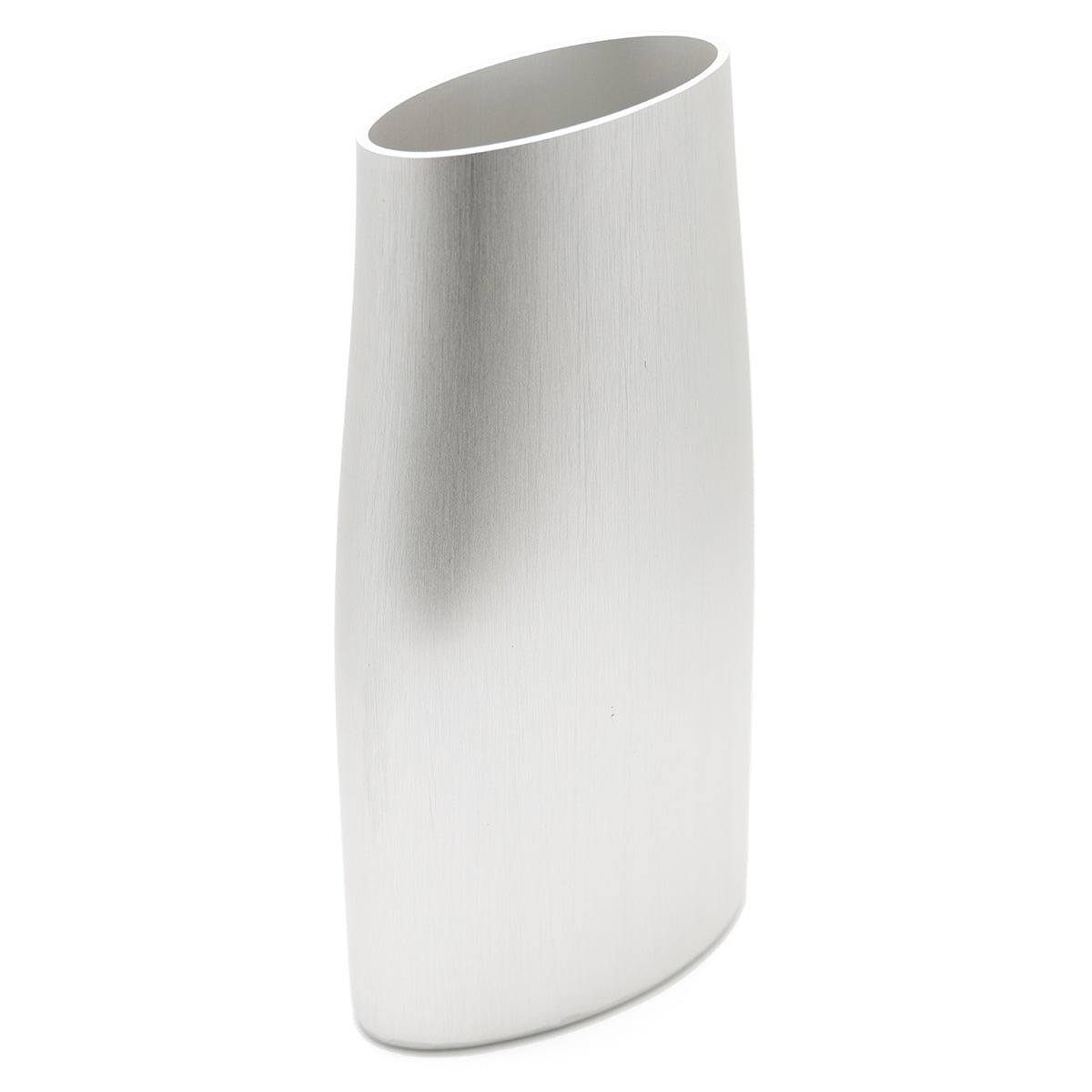 This vase seems to talk to us: it says; ‘I was once uniform and symmetrical but something has pushed me askew. I am alive with suggestion. I could be part of a leg. Or an object shaped by the elements. I don’t stand quite straight, with a subtle lean I appear to wander about. I’m a fin cutting through the water or a person clutching a bunch of gorgeous blooms. My opening gleams like a silver halo and my vertical brushed surface moves upwards presenting its prized contents’.