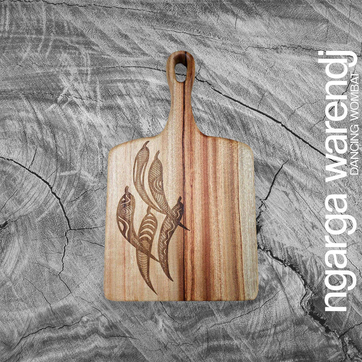 Each board has its own distinct natural pattern and is embellished with an Original Design by Ngarga Warendj – Dancing Wombat – based on the Traditional symbols of South Eastern Aboriginal Art. Your board comes with a card that gives the story of the artist and design.