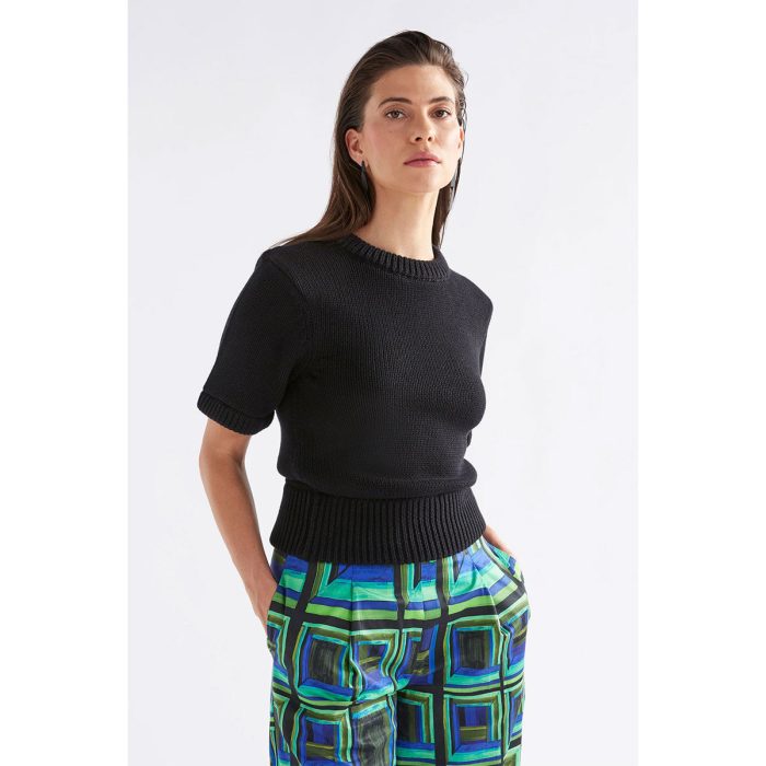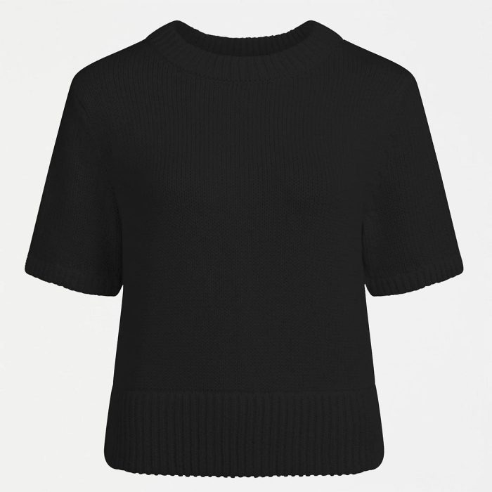 Made from a soft organic cotton yarn, this short sleeve sweater features a cropped body length and clean, doubled rib finishes at the hem, neck, and s