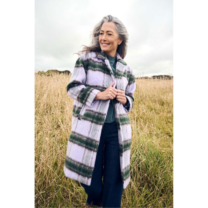 The Highland coat is a cosy and chic textured check coat in a relaxed fit, with dropped shoulders, a narrow collar and lapel, V-neck and side pockets,